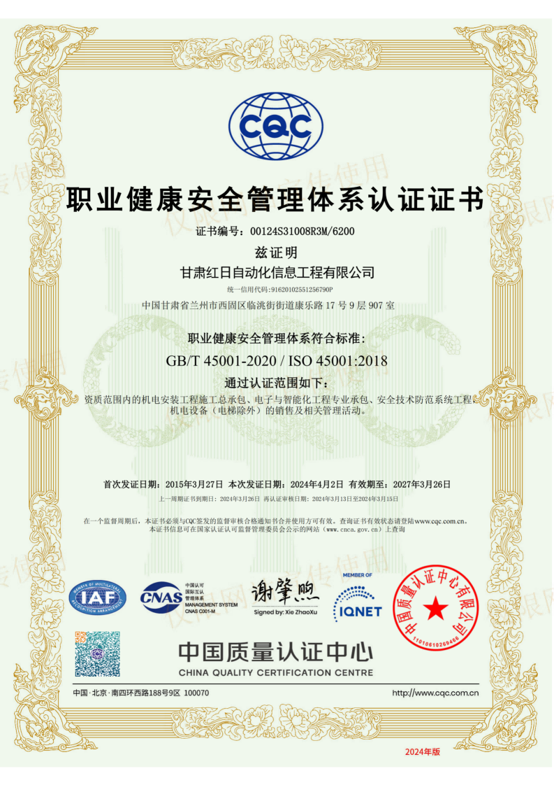 职业健康安全管理体系认证证书