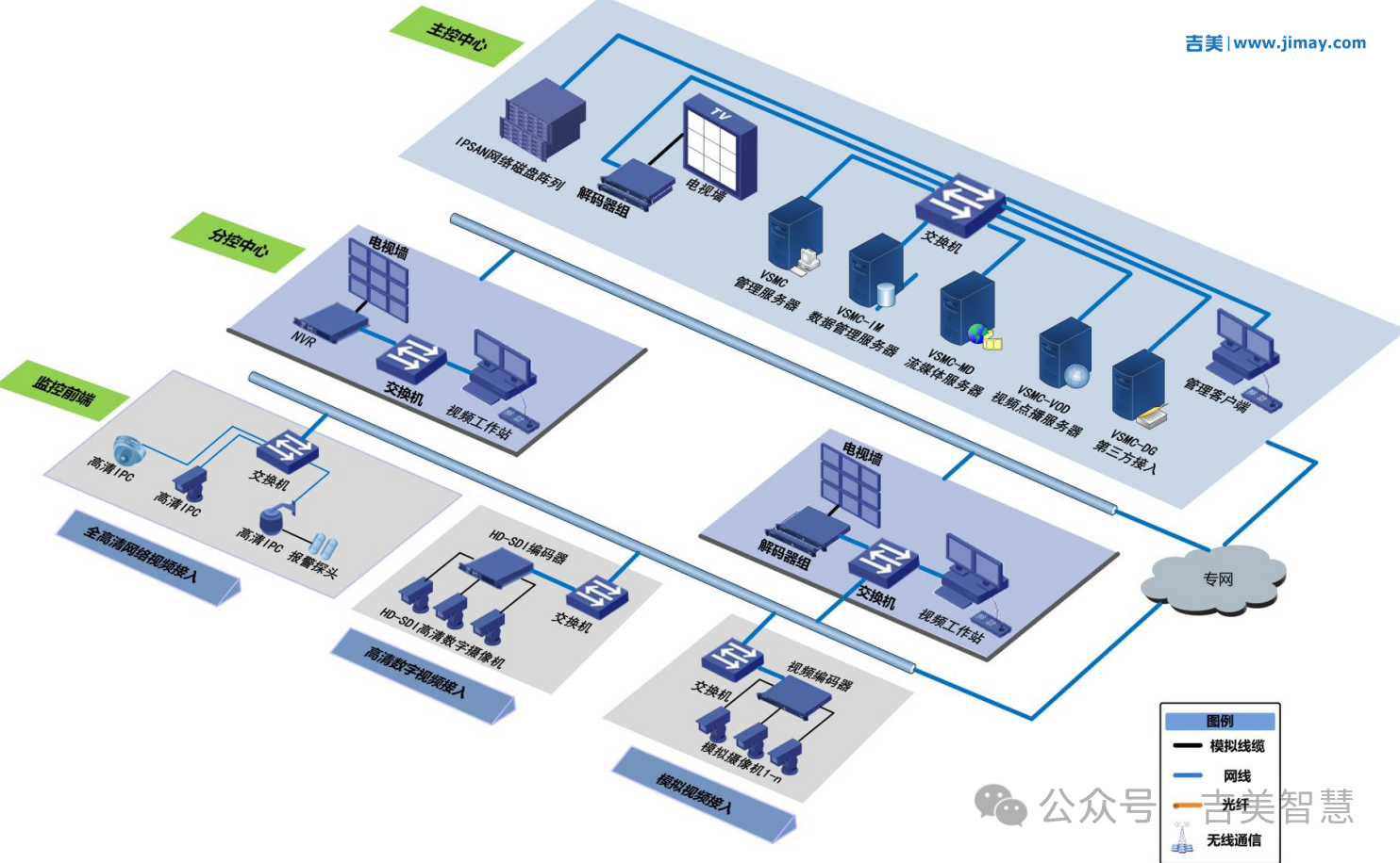 为了达到国内领先的目标,系统设计应该充分考虑系统的合理性、先进性、易维护性、开放性、实用性、可靠性、可扩展性和安全性的原则。VSMC系统是深圳市吉美智慧科技有限公司充分调研各领域用户视频监控实际应用经验和需求,结合最新视音频、联网、存储技术自主研发推出的新一代视频监控综合联网管理平台。支持从单级单域到多级多域不同的组网方式,灵活的组件扩容方式和强大的多级多域特性充分保证了组网的弹性扩展能力,真正满足从小型监控网络到几十万路超大规模监控系统的组网部署和系统扩展需求。