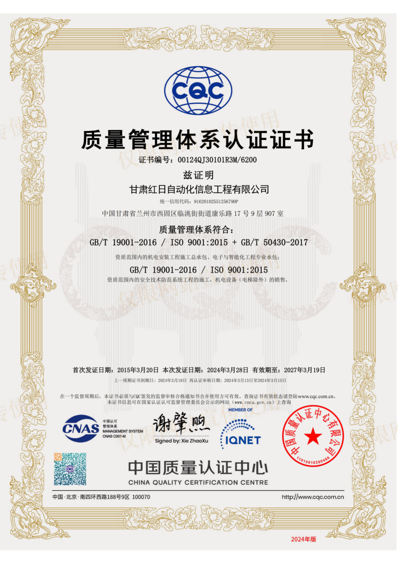 质量管理体系认证证书