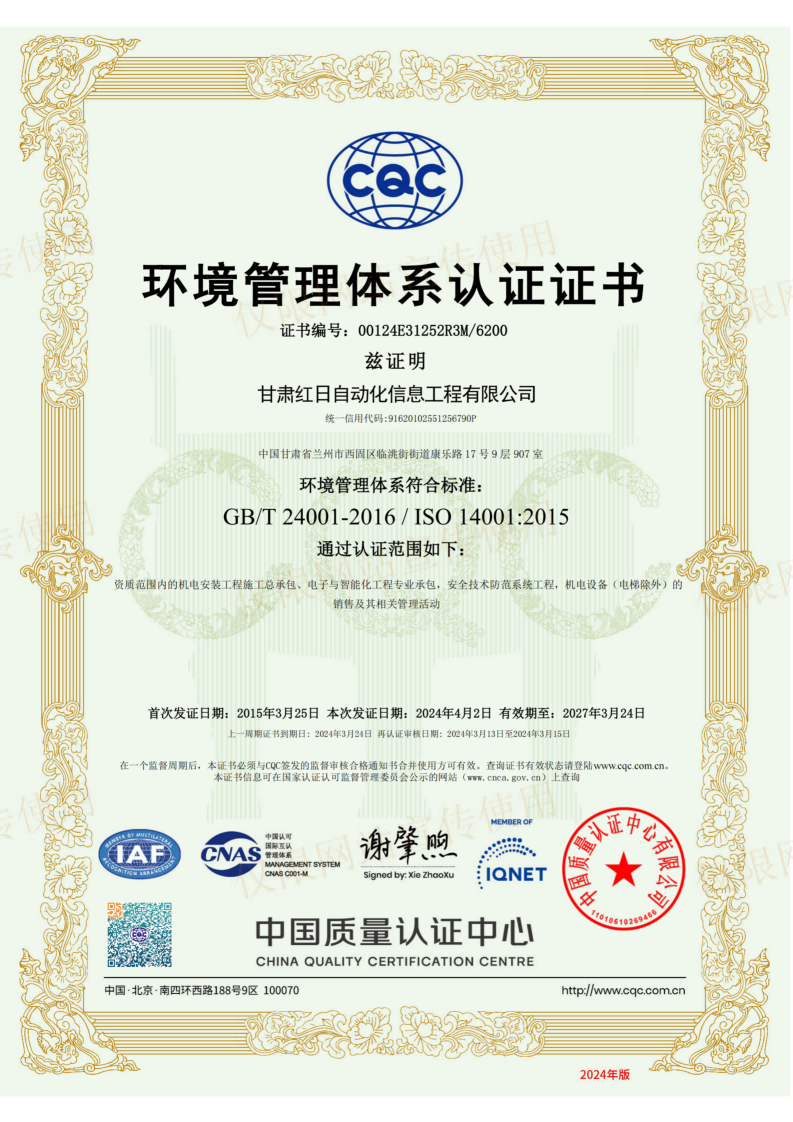 环境管理体系认证证书