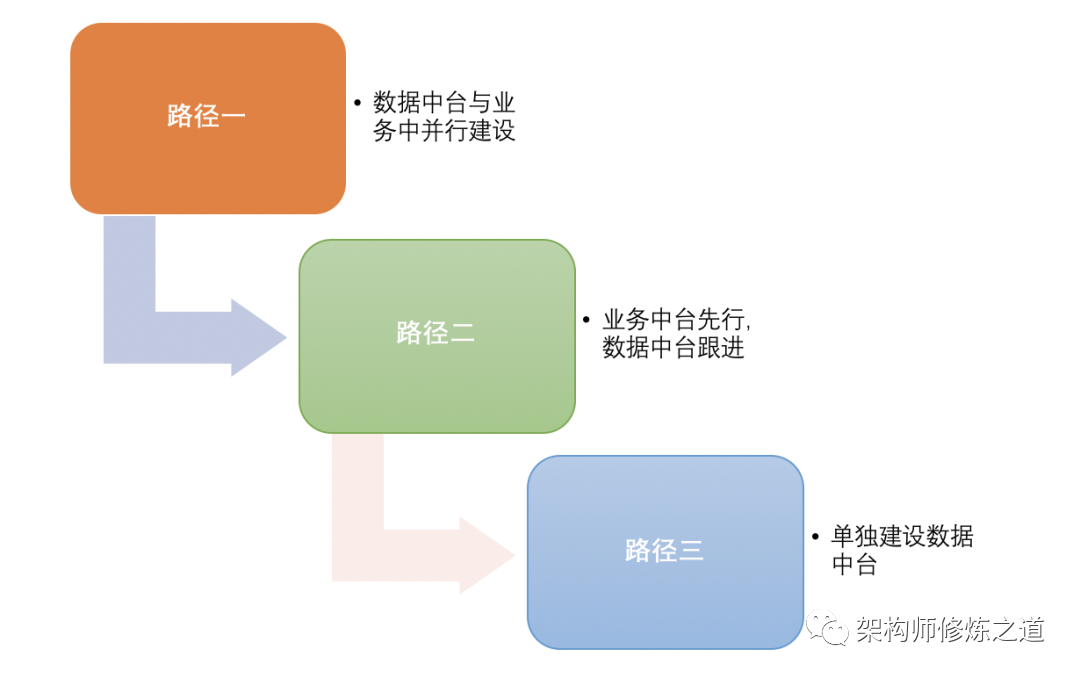 数据中台的建设路径,跟企业的业务所处的业务阶段有关,亦跟企业所处的信息化建设阶段有关。行业里的数据中台建设路径,总体可以分为以下三类: