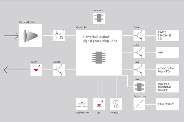 这样一个传感器的内部由众多组件组成(见图2) :带有激光二极管和超快速驱动器的光发射器,带有透镜、滤波器和模数转换器的接收器,高性能数字信号处理、存储器、输入和显示元件,以及大量数字和模拟工业接口。所有这些都装在一个专为工业用途而设计的紧凑型外壳中。此外,还设计了具有加热功能的传感器型号,因此激光传感器也可以在寒冷的室外环境中运行,无需外部加热。