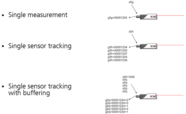 单传感器跟踪:可以使用sNh命令触发连续测量。根据应用程序的不同,传感器可以根据设定的时间连续输出测量距离。所需的采样时间可以用命令sNh+x (x可以在0到8,5 40 ,000毫秒之间自由设定)。这种类型的测量被用于各个领域(木材工业,钢铁工业,监测,物流等)。
